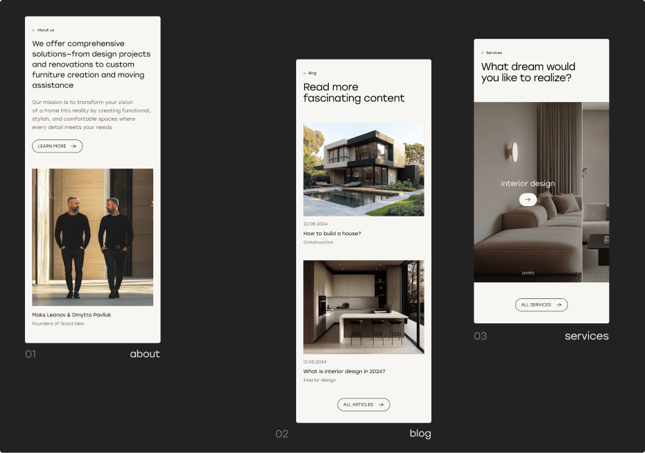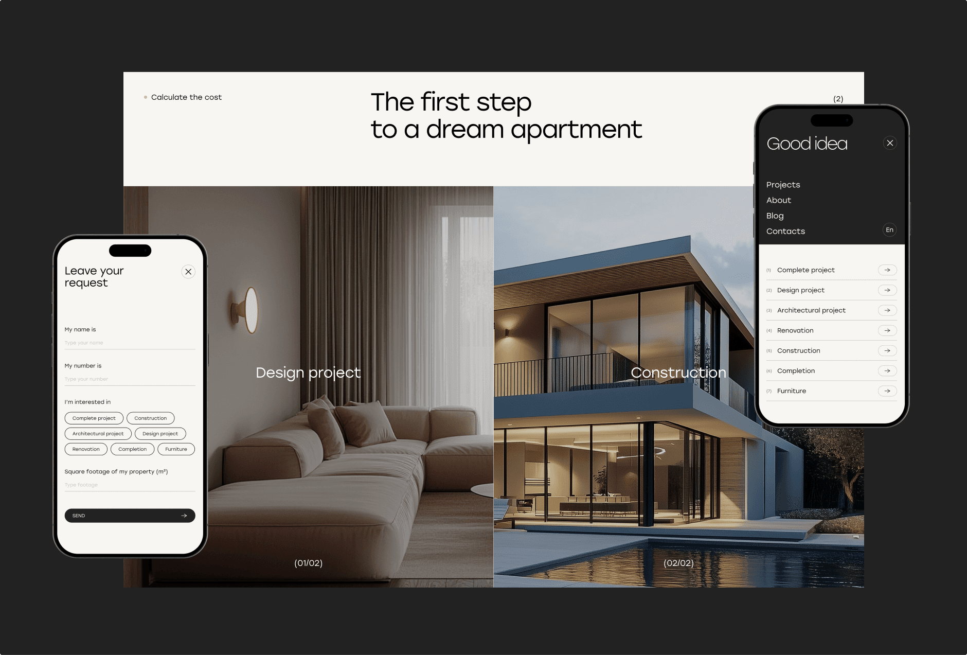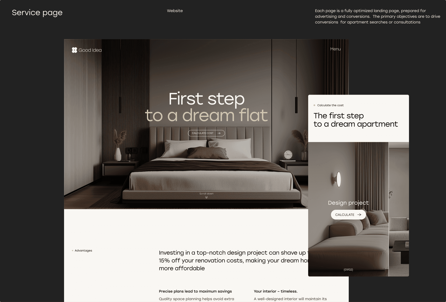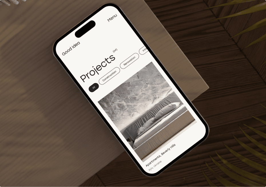 Client: Good Idea is a interior design and renovation studio specializing in transforming residential and commercial spaces into functional and aesthetically pleasing environments. Challenges: Captivating Portfolio and detailed case studies, Clear Services Presentation, Separate pages for each service to provide detailed insights