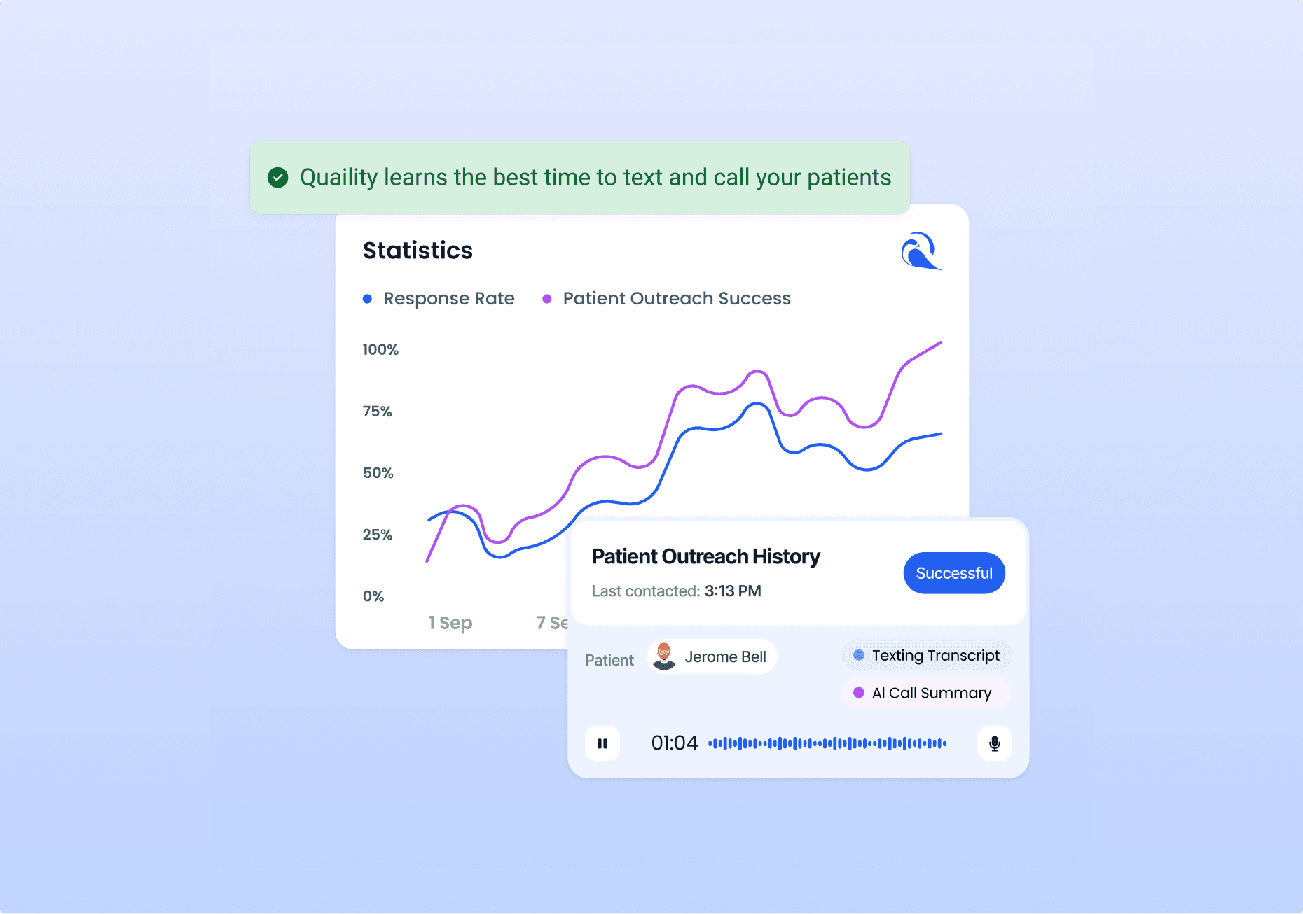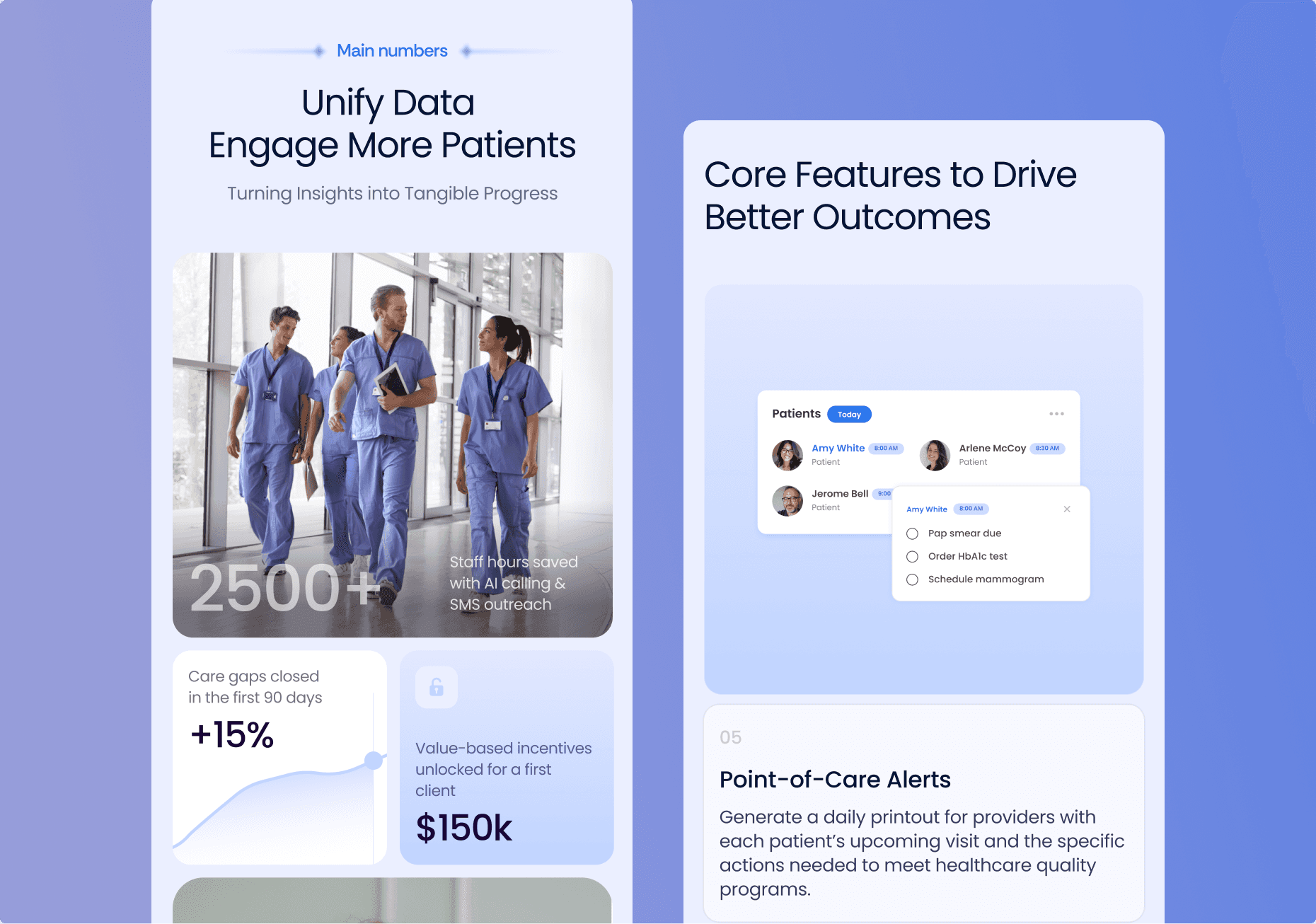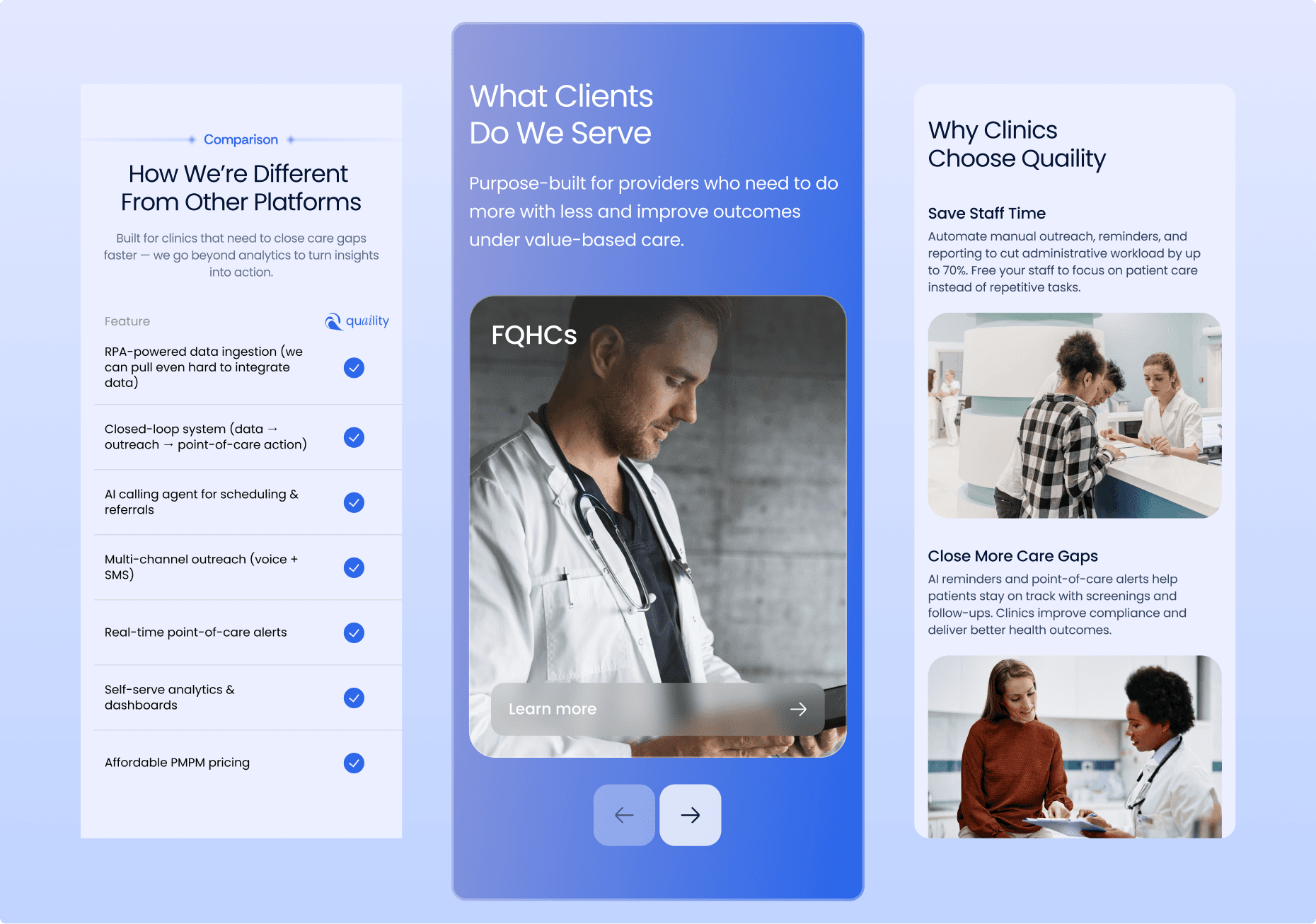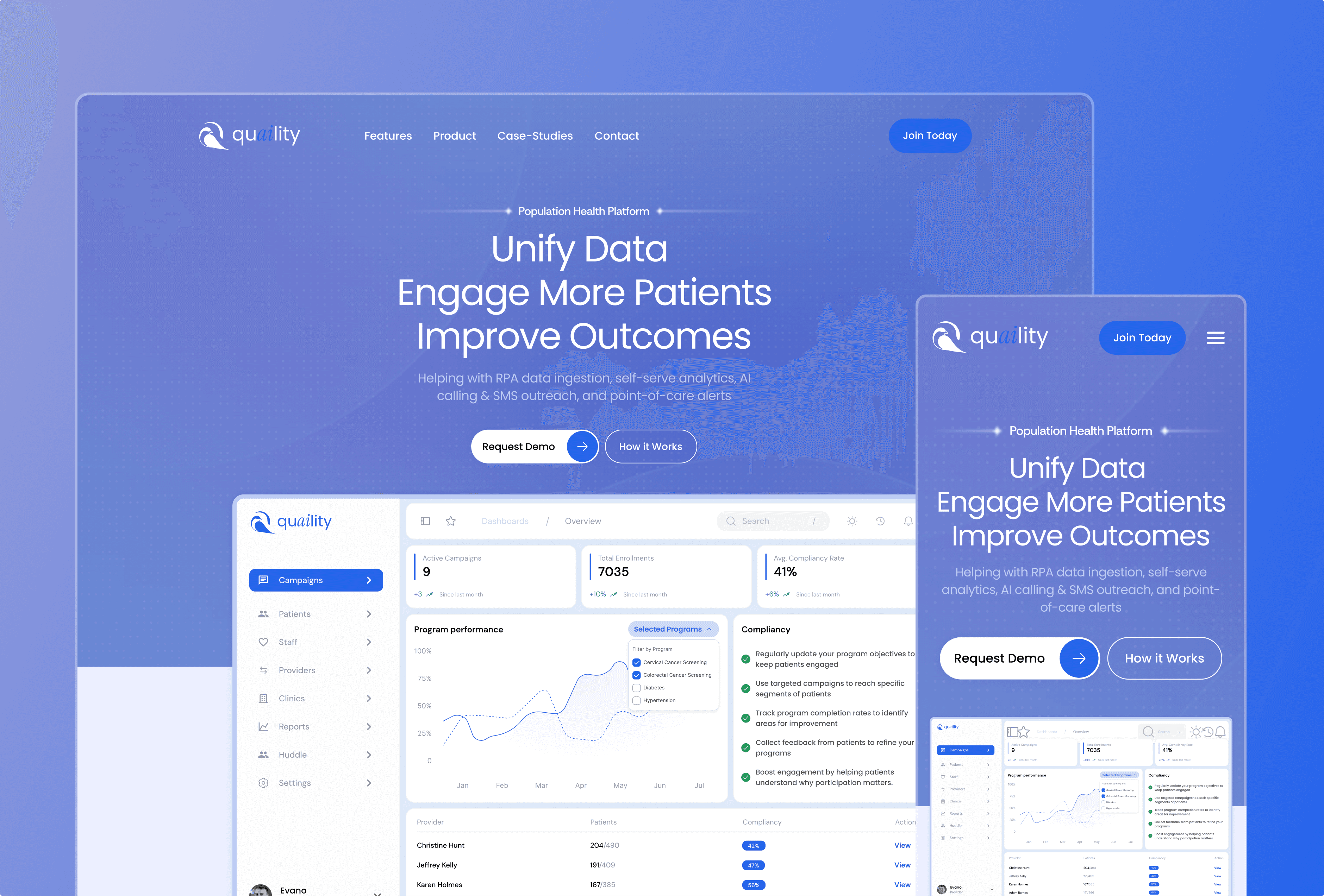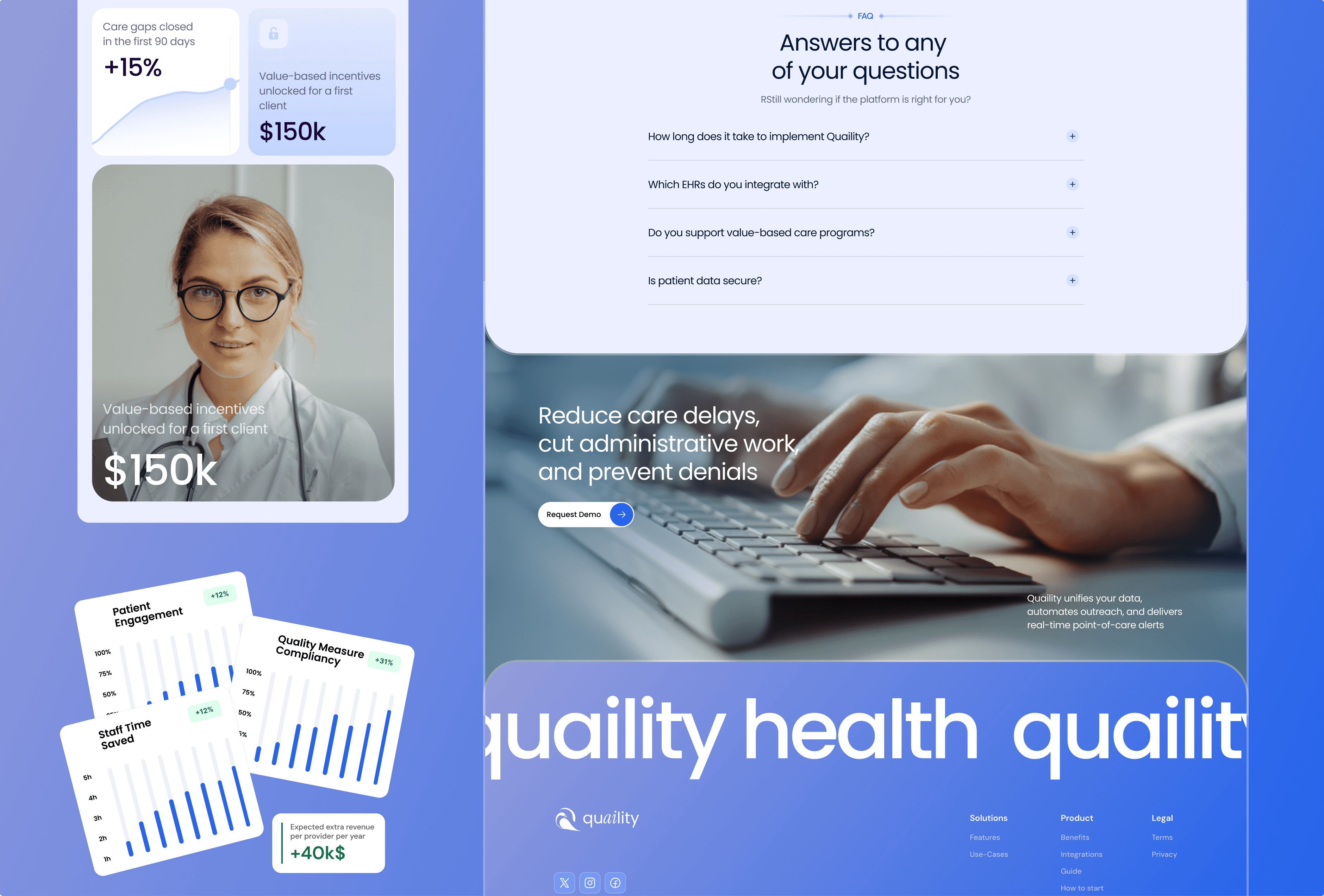 Client: Quaility is an AI-powered population health platform that helps clinics close care gaps, improve quality scores, and automate patient outreach. Challenge: Build a clear, conversion-focused landing page that explains a complex healthcare product AI calling, data integration, analytics, and point-of-care alerts in a simple and trustworthy way for event-ready presentation and sales demos.