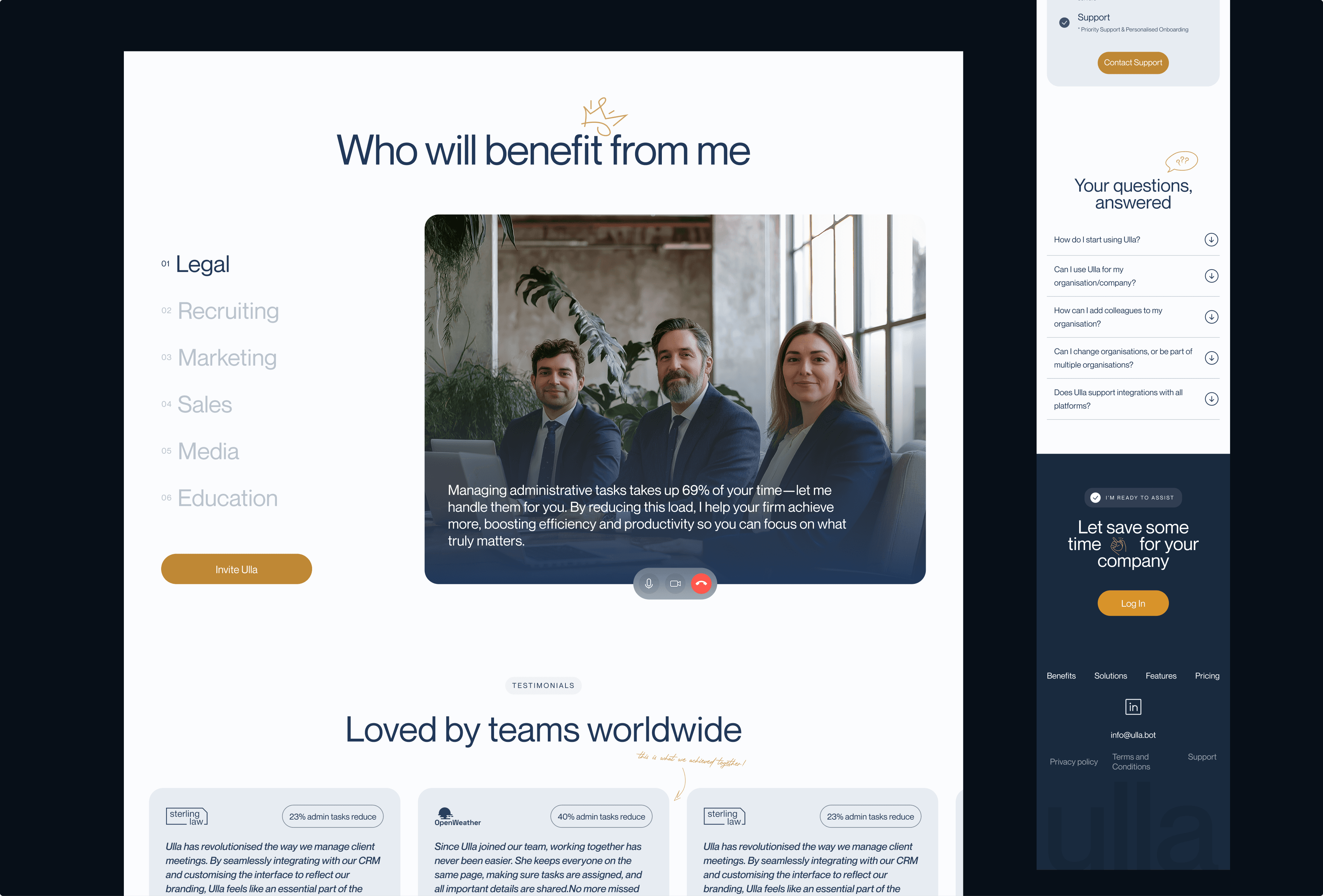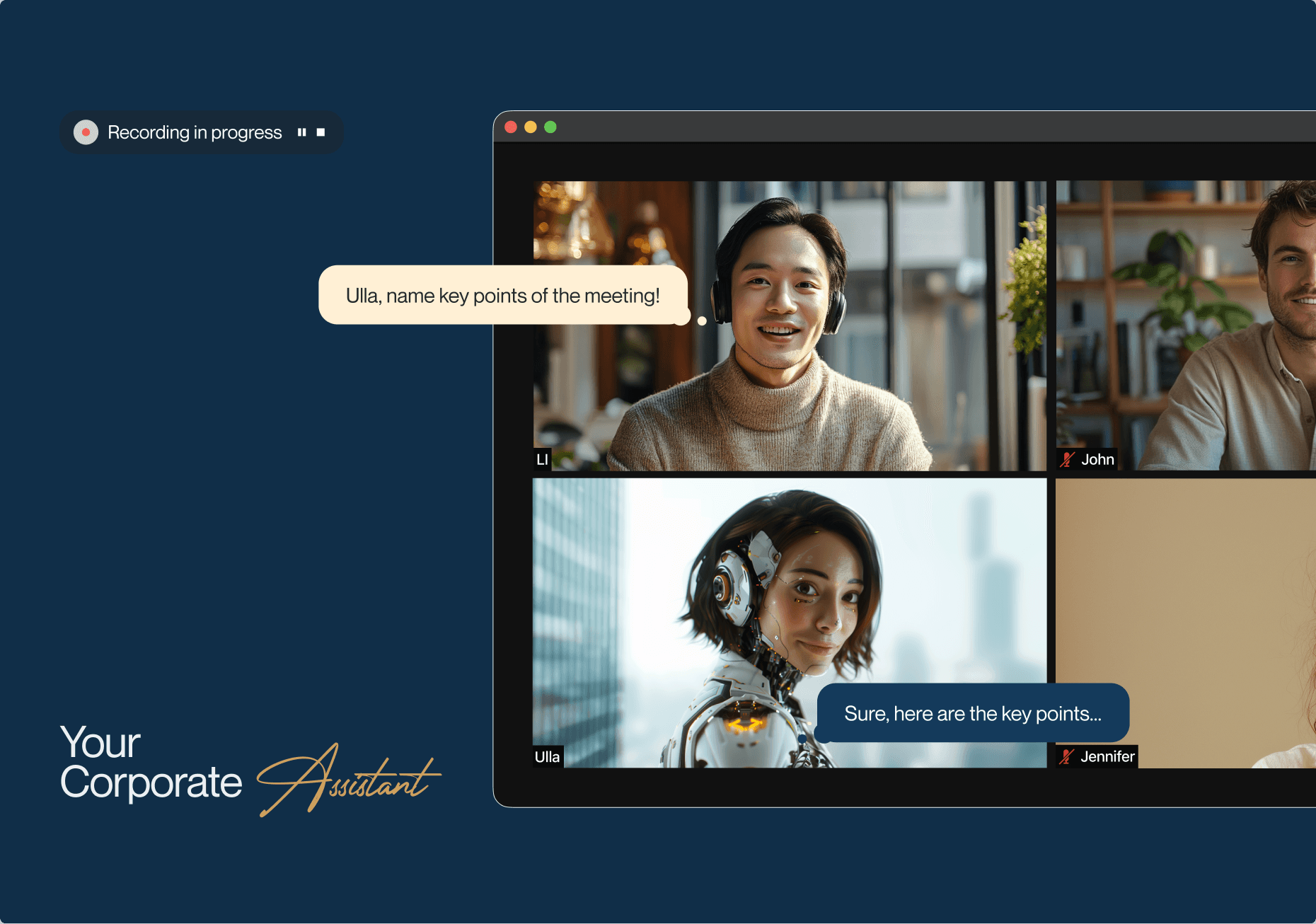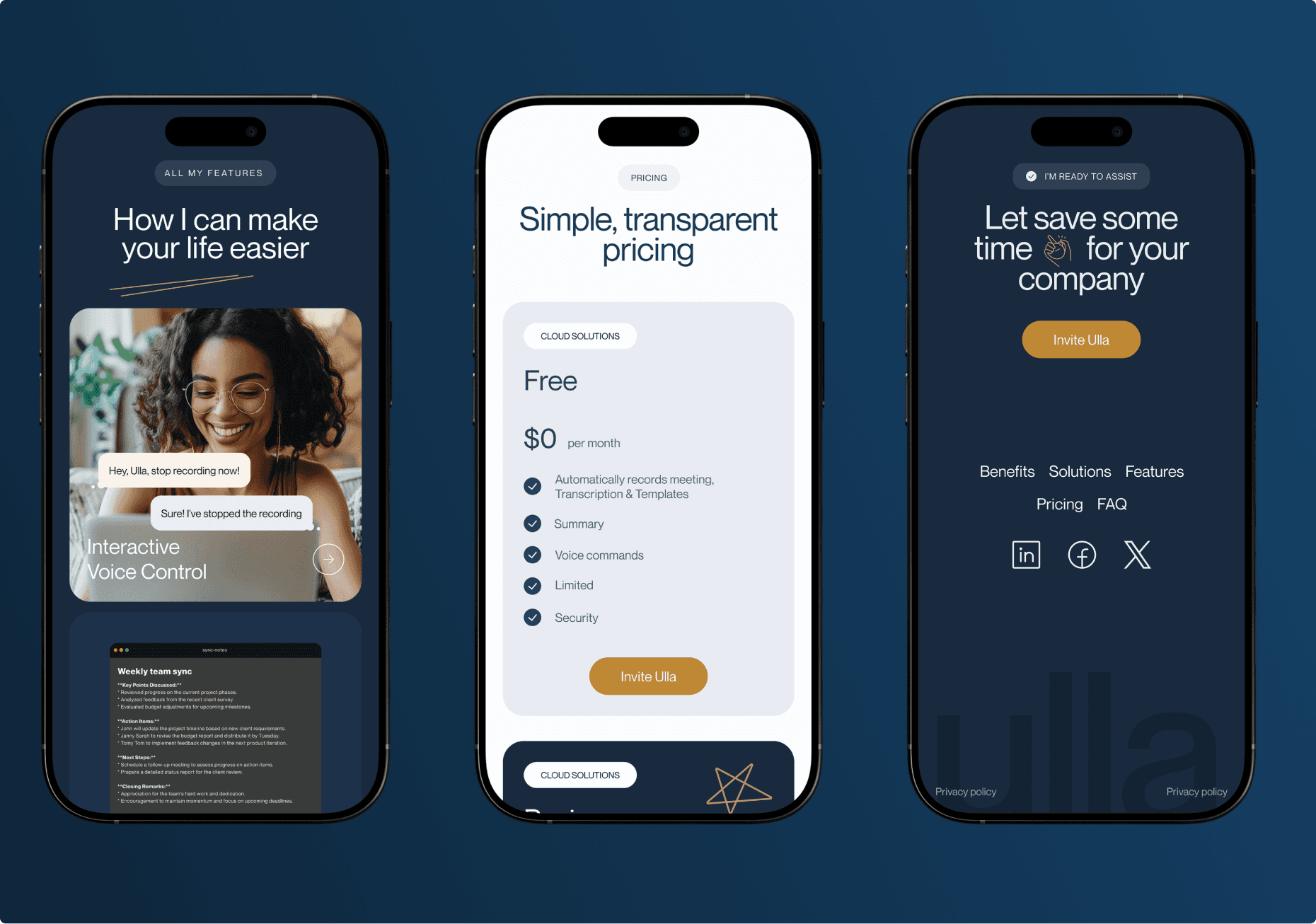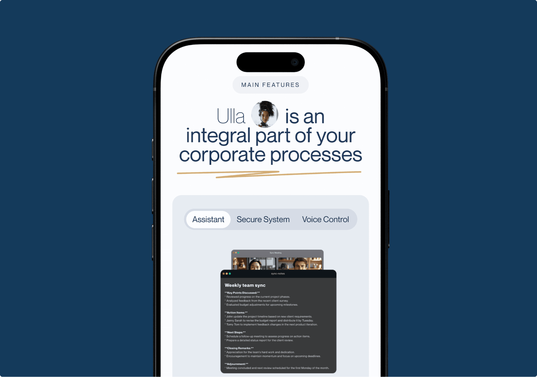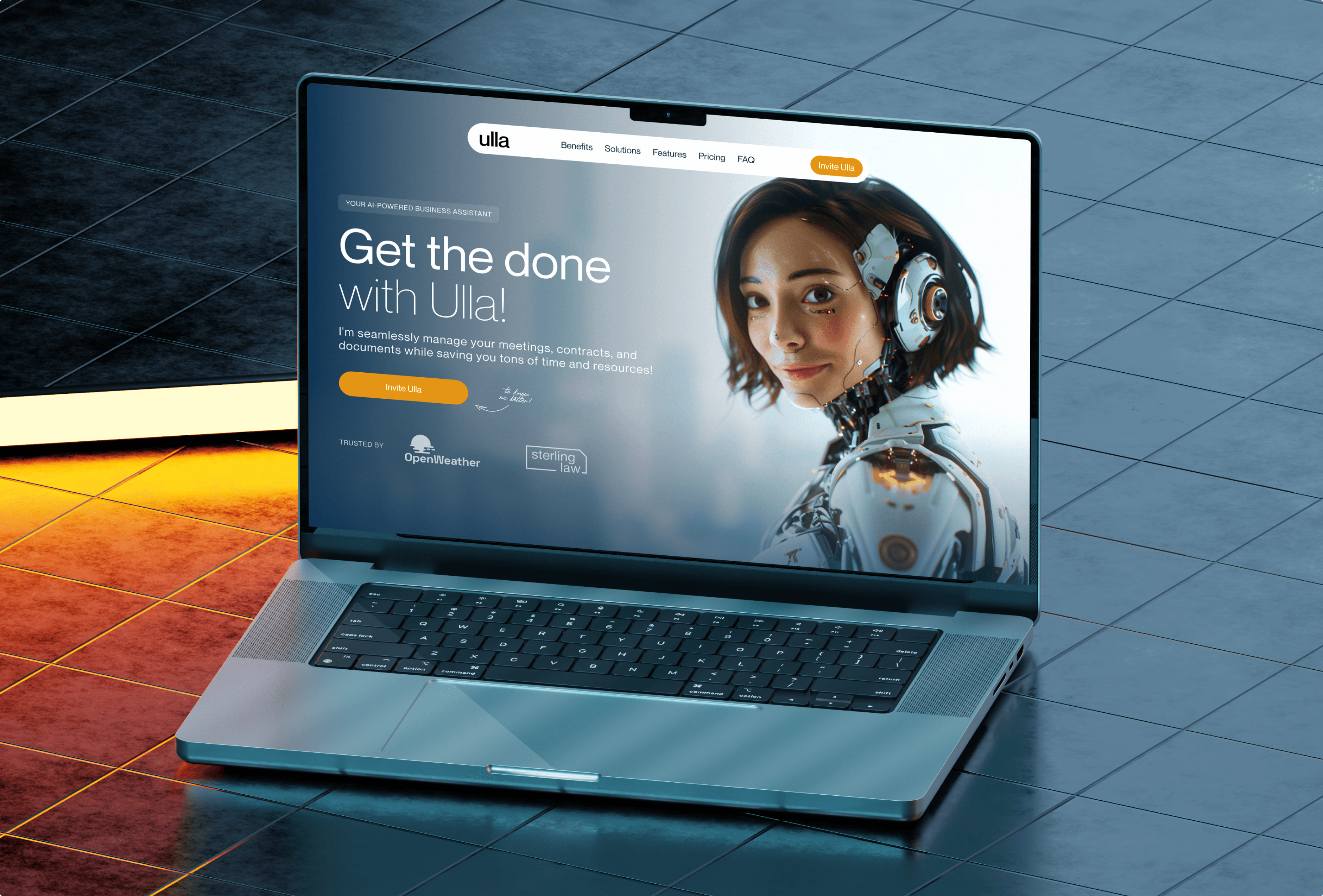 Client: Ulla is an AI-powered business assistant designed to streamline corporate workflows. With features like automated meeting transcription, interactive voice control, and secure data processing. Challenge: Ulla, a new AI business assistant, needed a standout website to break into a competitive market. The goal: attract early adopters, build trust, and showcase its unique value—automated meetings, voice control, and secure data handling—while effectively converting visitors into users.